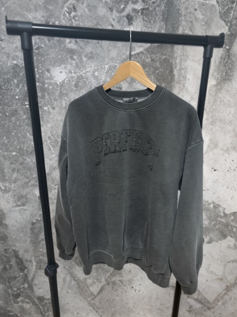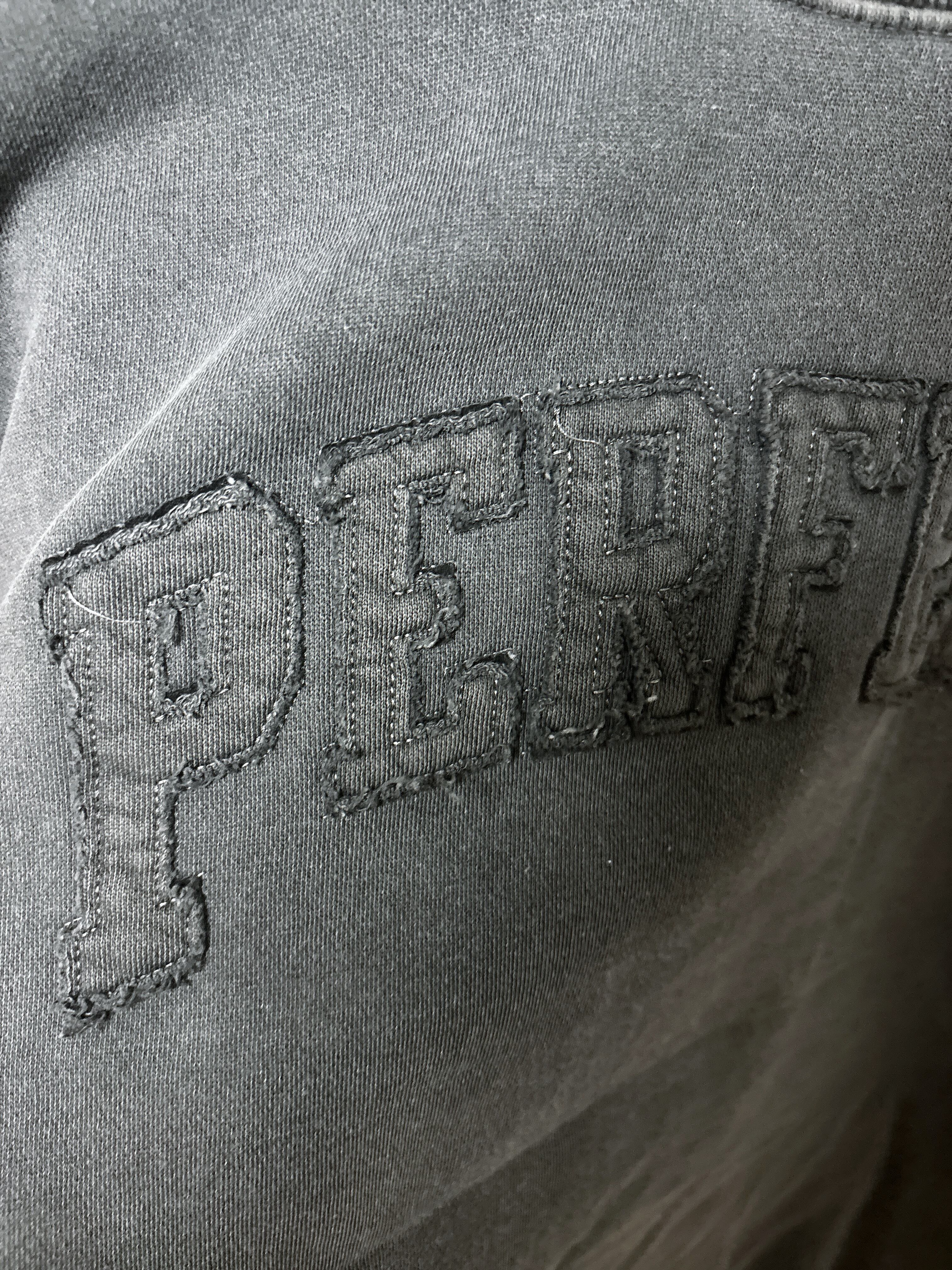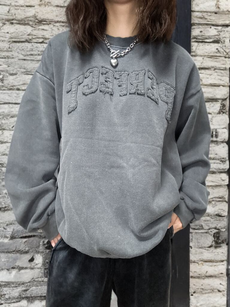 胸元の立体ロゴ刺繍「PERFECT」が存在感を放ち、シンプルながらも印象的なデザインです。