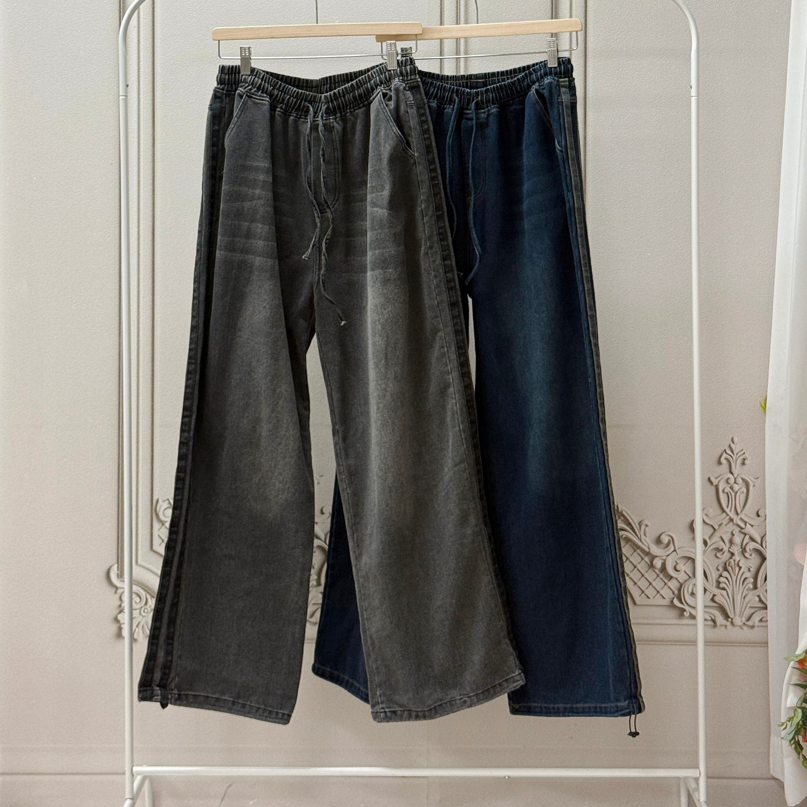 サイドラインが印象的なストリートムード満載のワイドデニムパンツ。